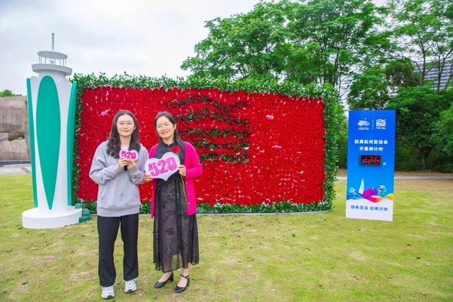 现场由4000余朵玫瑰组成的巨型花墙,与“亚帆灯塔”紧紧相依,旁边的杭州亚运会吉祥物雕塑俏皮可爱,搭配上“扬帆亚运”“动感沙排”两大赛事卡通造型,一场“象山携手亚运,‘520’为爱前行”的主题打卡区赚足人气,过往市民们纷纷拍照留下幸福的瞬间。市民陈女士一家特意前来打卡,互相表达内心祝福:“希望家人健康,我爱你们,同时也表达了对亚运的美好期待。