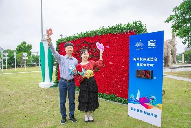 亚帆灯塔、巨型花墙、爱心灯柱……5月20日一早,记者在象山县人民广场看见,不少领证新人、热恋情侣、亲子家庭等驻足打卡,传递对彼此的浓浓爱意,表达对亚运的美好期盼。